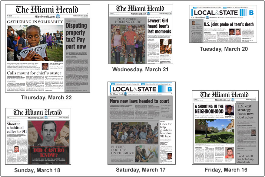 | During a one-week period in March 2012, the Herald featured the Trayvon Martin story on six section front pages. (Click here to enlarge graphic.) |